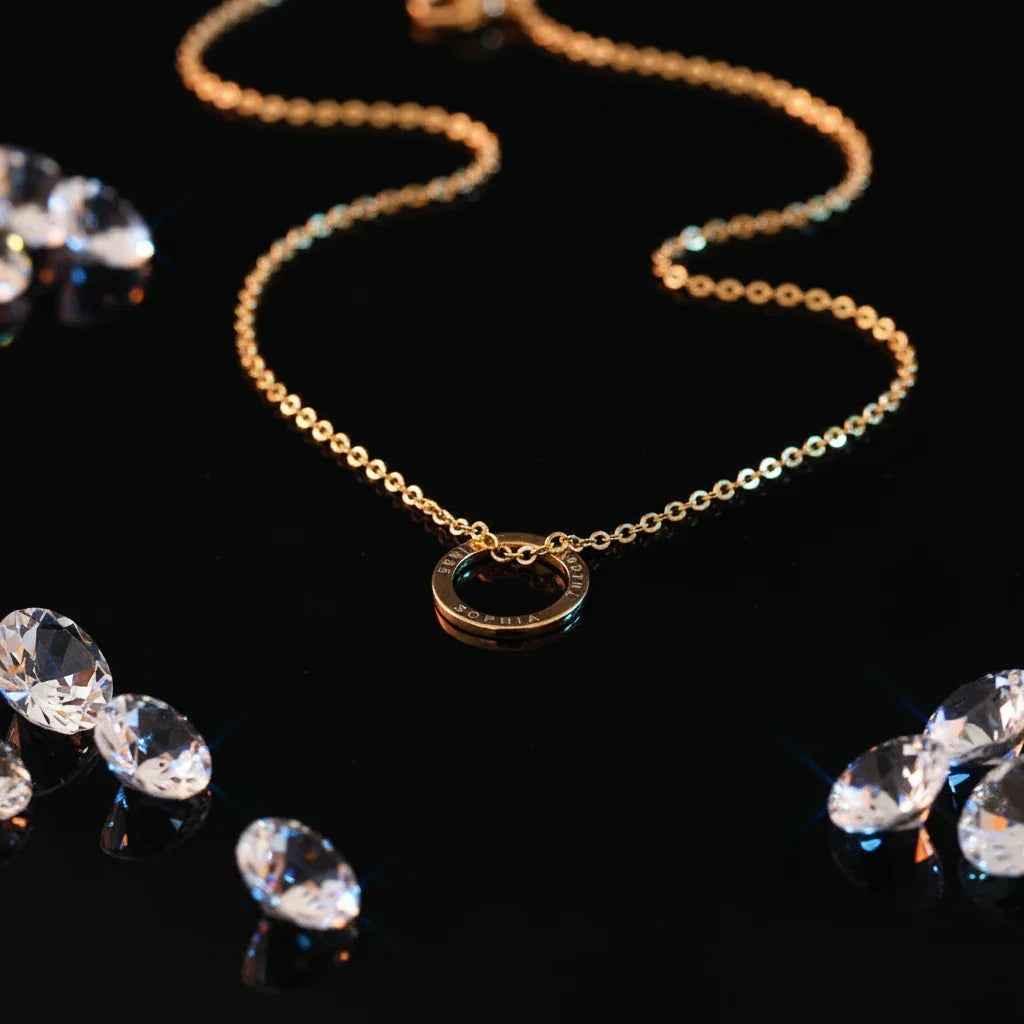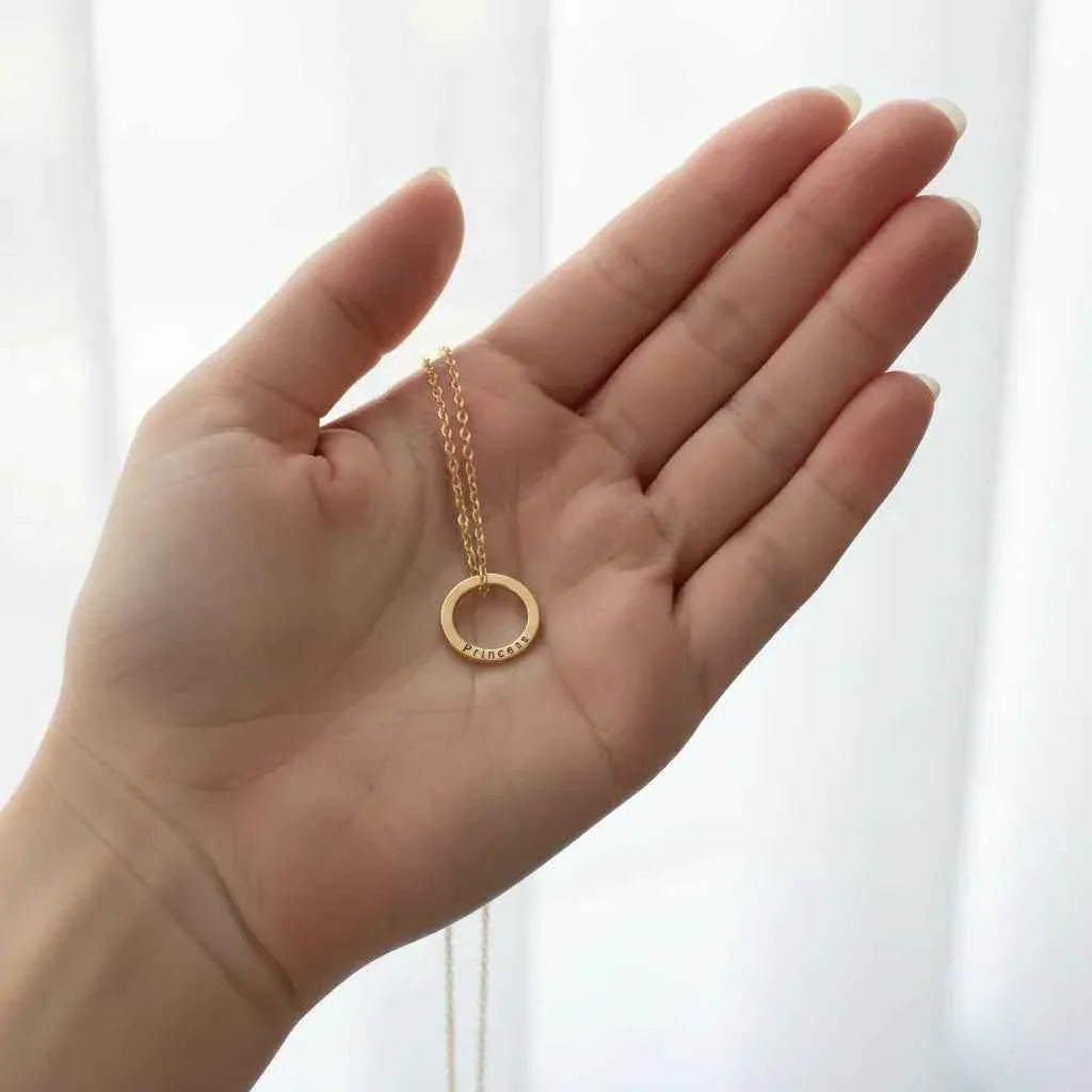 A minimalist yet meaningful Custom Necklace designed as an eternity circle to symbolize wholeness and lasting connection. Personalize this engraved circle pendant with names, initials, or a special date; the polished stainless-steel base with a radiant gold finish delivers everyday durability and timeless style. The adjustable chain sits comfortably at 45 cm with a 5 cm extension for the perfect fit, making it a thoughtful Gift for Her for birthdays, anniversaries, or keepsake moments. Crafted to be hypoallergenic and tarnish-resistant, this personalized photo-free design focuses on clean geometry and refined shine while keeping your most cherished words close.