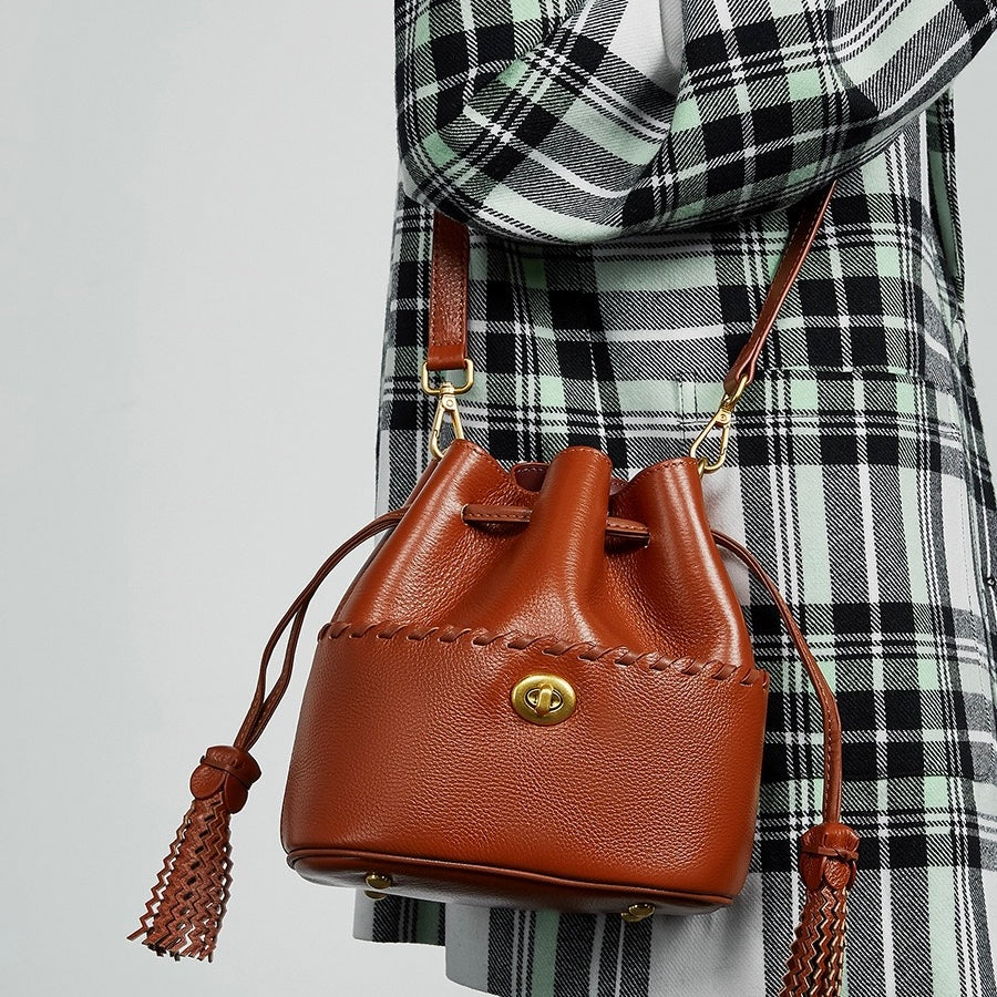 Crafted from premium top-grain cowhide, this medium-sized bucket bag showcases trendy fringe details and features a secure lock, ensuring both style and security.