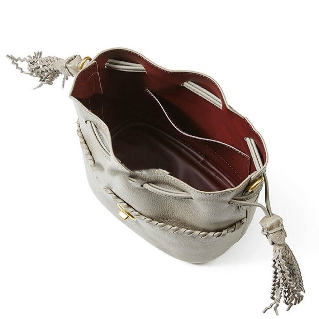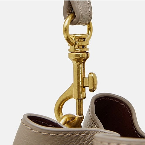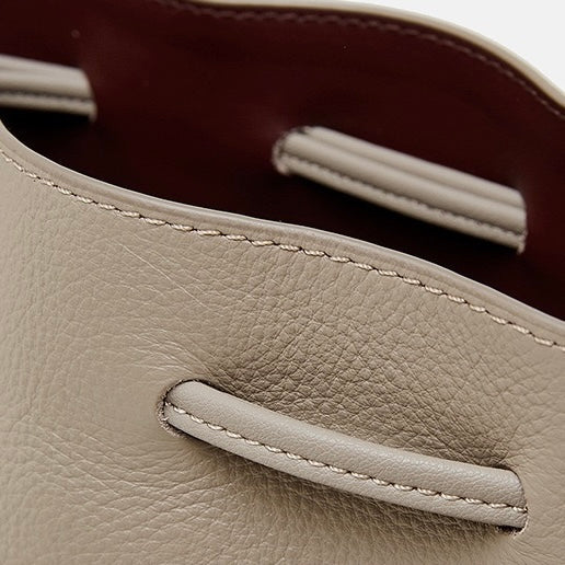 Its unique bucket shape, complemented by a drawstring closure, opens to reveal a thoughtfully designed fabric-lined interior, complete with a zippered secret pocket for your essentials. The medium hardness of the leather guarantees durability while maintaining a sophisticated silhouette, making it perfect for daily outings or special occasions.
