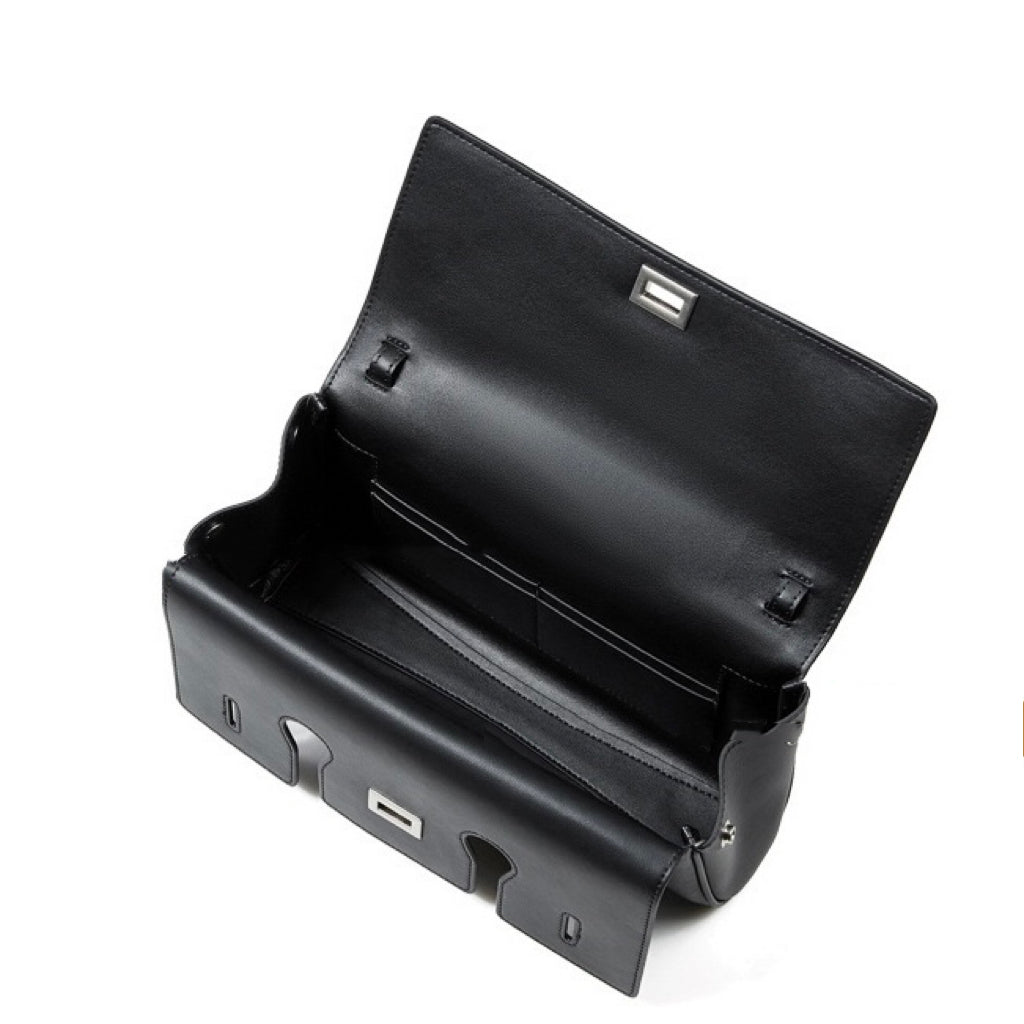 Indulge in sophistication with the Women's Genuine Leather Designer Lock Clasp Shoulder Handbag. This exquisite accessory is meticulously crafted from premium genuine leather, showcasing a chic design that marries style with practicality. The trendy horizontal square shape is adorned with a sleek lock clasp closure, providing both security and elegance.
